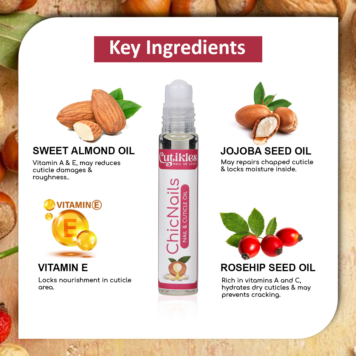 - Rosehip Oil: Loaded with Omega-3, it helps prevent peeling, dryness, and brittle nails, keeping your nail area smooth and healthy.